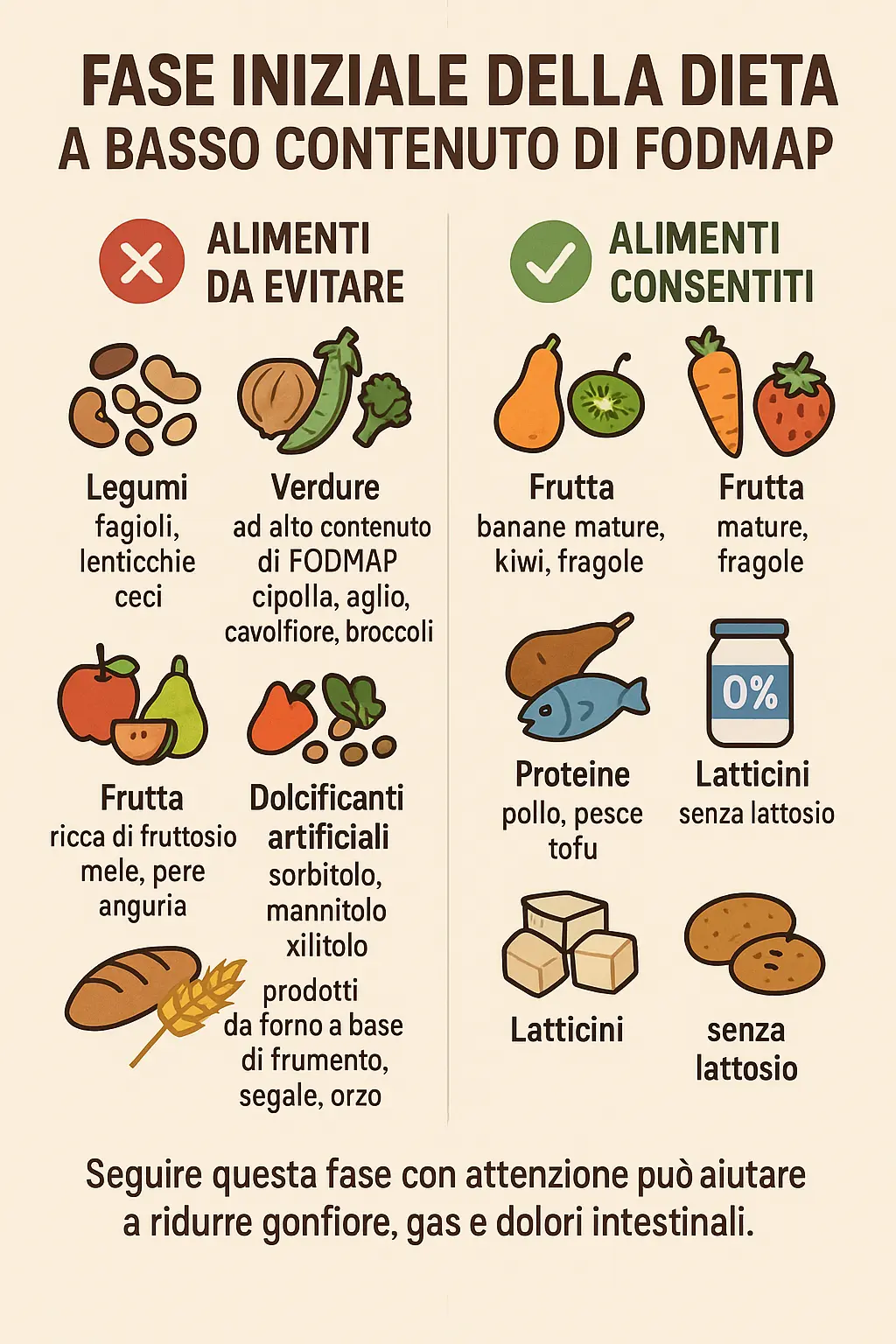 Nella fase iniziale della dieta a basso contenuto di FODMAP, è importante evitare alcuni alimenti che possono accentuare i sintomi intestinali. Tra questi rientrano i legumi come fagioli, lenticchie e ceci, le verdure ricche di composti fermentabili come cipolla, aglio, cavolfiori e broccoli, e alcuni tipi di frutta ad alto contenuto di fruttosio come mele, pere e anguria. Anche i dolcificanti artificiali come sorbitolo, mannitolo e xilitolo, così come i prodotti da forno a base di frumento, segale e orzo, andrebbero esclusi in questa prima fase.